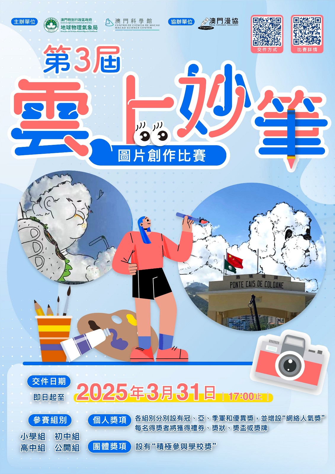 為推動氣象科普教育,地球物理氣象局聯同澳門科學館合辦、澳門漫畫從業員協會協辦第三屆“雲上妙筆圖片創作比賽”,冀提升公眾對天氣情況的關注和認識,以及對雲種等氣象知識的了解。比賽由即日起至2025年3月31日接受報名,歡迎合資格人士踴躍參與。
