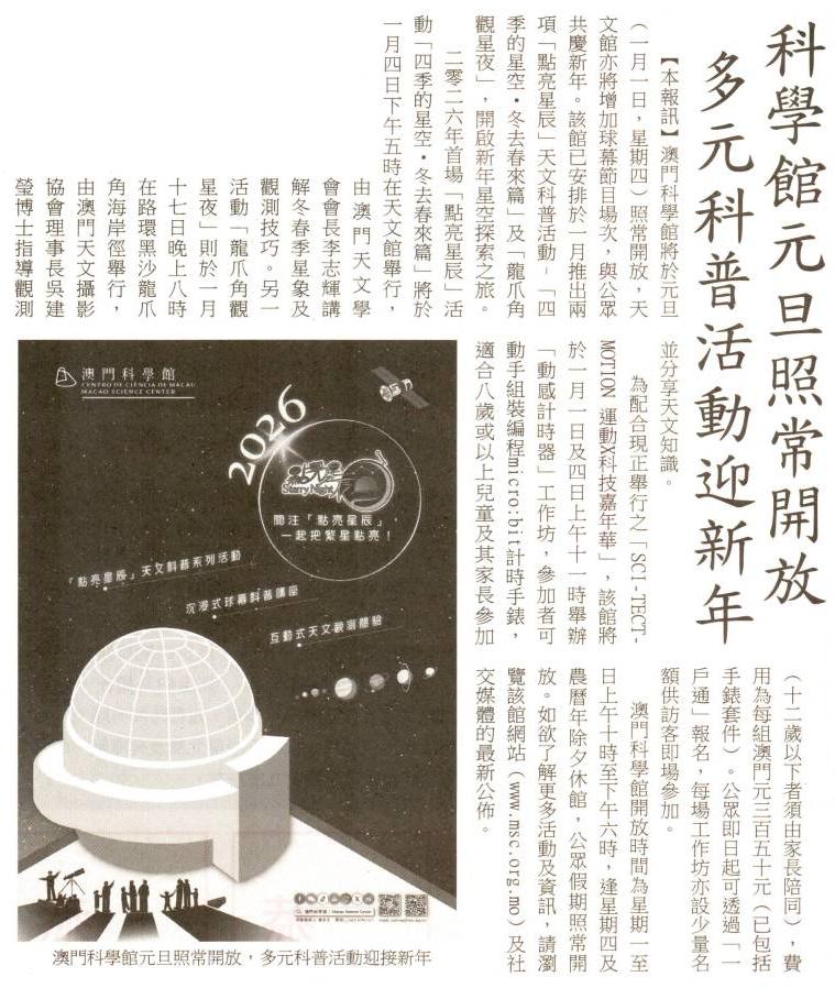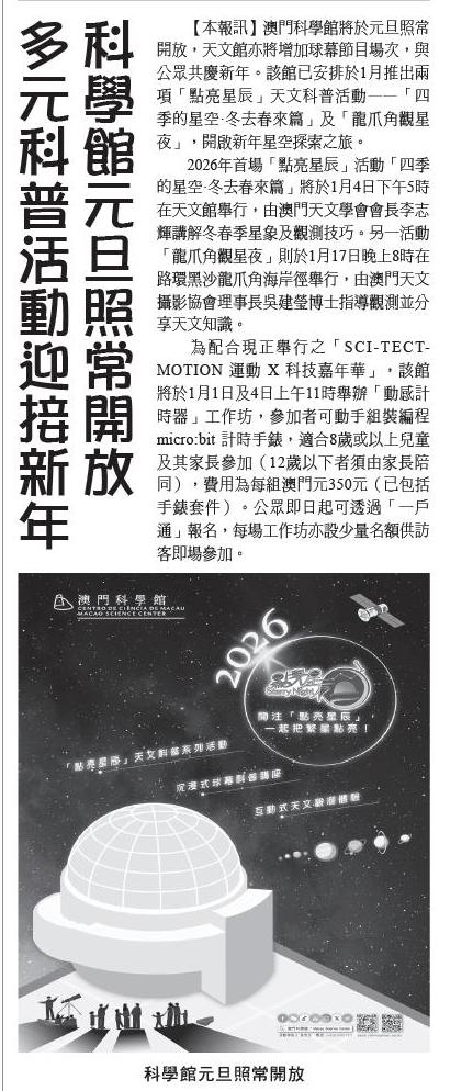 2025.12.31《新華澳報》科學館元旦照常開放 多元科普活動迎接新年