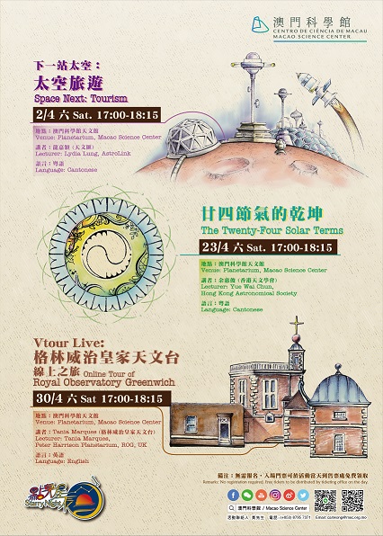為培養公衆對天文科學的興趣,澳門科學館將於4月舉辦三場「點亮星辰」天文科普系列活動,內容包括探討人類到太空旅遊及居住的可行性、中國傳統文化二十四節氣,更會帶領大家走進天文歷史的發源地——英國倫敦格林威治皇家天文台,讓公眾從多個角度接觸豐富的天文知識。
