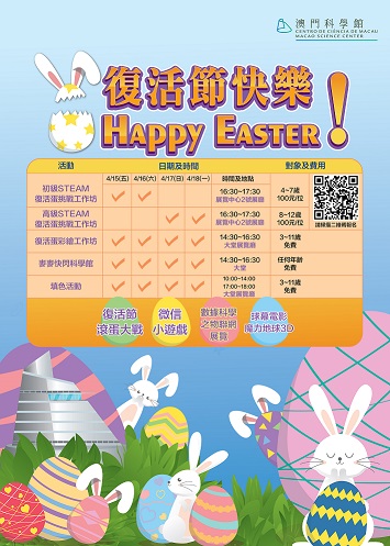 爲與公衆歡度復活節假期,澳門科學館已安排了多項精彩的活動。4月15日至18日,本館2號展廳內將舉辦「STEAM復活蛋挑戰」,參加者可於工作人員的指導下進行簡單的科學實驗,嘗試把普通的雞蛋殼變成閃爍的「水晶洞」、接受雞蛋承重力挑戰及製作璀璨奪目的「星雲復活蛋」。此活動由即日起至4月6日接受報名,費用為澳門元100元正,歡迎4歲至12歲兒童及其家長踴躍報名參加(報名連結:https://sites.google.com/view/mscactivity/)。所有參加活動的小朋友須由一名家長陪同出席。