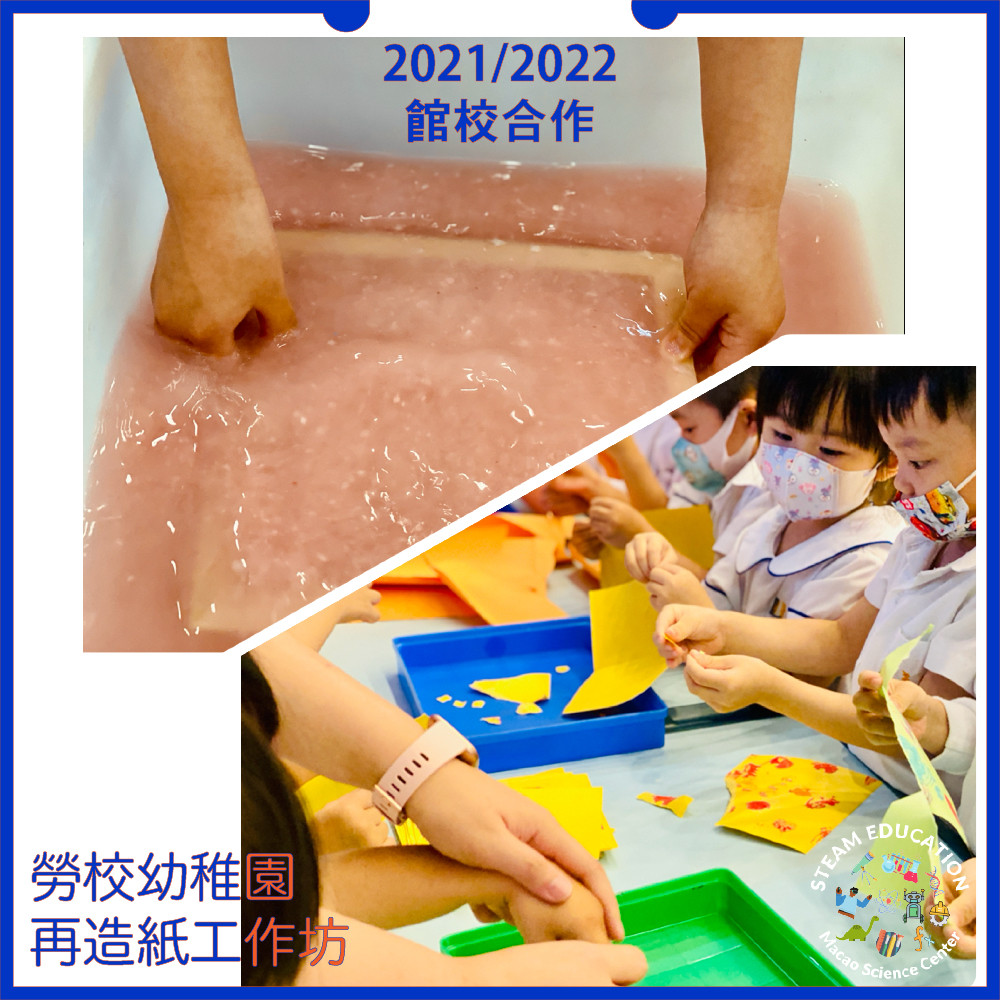 一張標準的「再造紙」,其原料成份必需含有至少百分之80的廢紙。究竟勞工子弟學校幼稚園 K1 級參加的「再造紙工作坊」的造紙原料是從哪裏來的呢?原來材料都是同學們用過的舊畫紙!這個活動為他們的舊畫紙賦予第二生命,製成再造畫紙後又可以在上面繼續作畫了。我們期望小朋友透過參與工作坊,認識造紙的過程,學會節約用紙、珍惜資源,及早樹立環保觀念。