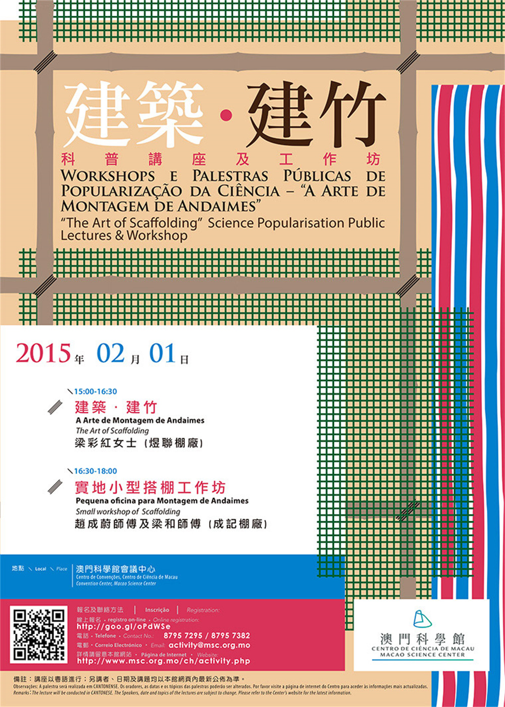 為配合本舘於去年底推出之「拍攝‧科學——2015澳門科學館多媒體創作比賽」,加深公衆對建築工程中常用的竹棚工藝的認識,本館將於2月1日(星期日)在澳門科學館會議中心舉辦「建築‧建竹」科普講座及工作坊。