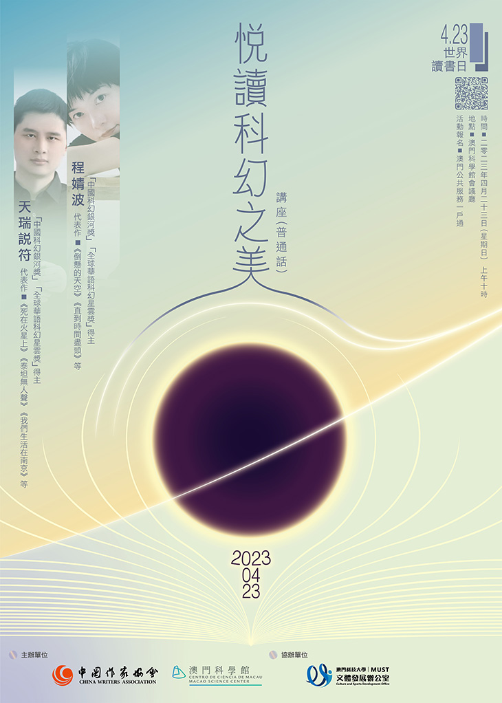 為響應「世界閱讀日」,由中國作家協會及澳門科學館主辦、澳門科技大學文體發展辦公室協辦的「悅讀科幻之美」青年科幻作家講座將於4月23日上午10時在澳門科學館會議廳舉行,兩位多次獲得科幻文學界最高榮譽的中國科幻新生代作家程婧波、天瑞說符親臨澳門,分別以《時間旅行簡史》及《從0到1:科幻寫作與想像力》為題,帶領大家穿越時空,暢談科幻文學的發展史與市場現況,分享如何從零開始學習創作一部科幻小說,讓公眾零距離領略科幻文學的獨特魅力,並思考科幻創作怎樣成爲啟發未來科技的催化劑。活動旨在配合特區政府打造閱讀之城的施政理念,鼓勵科普閱讀及提升全民科學素養。