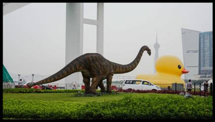 最近澳門科學館特別熱鬧。無論是本澳居民還是旅客,都說要來科學館「追星」,看看曾經稱霸地球長達一億六千多萬年的恐龍怎樣活現濠江,順道跟剛於上月底游到澳門度假的黃色小鴨來一張親密合照。兩大「明星」在澳門科學館首次碰頭,魅力實在難以抗拒,難怪五一國際勞動節假期期間,科學館内外都擠滿了慕名而來的、忙著拍照的「朝聖者」了。
